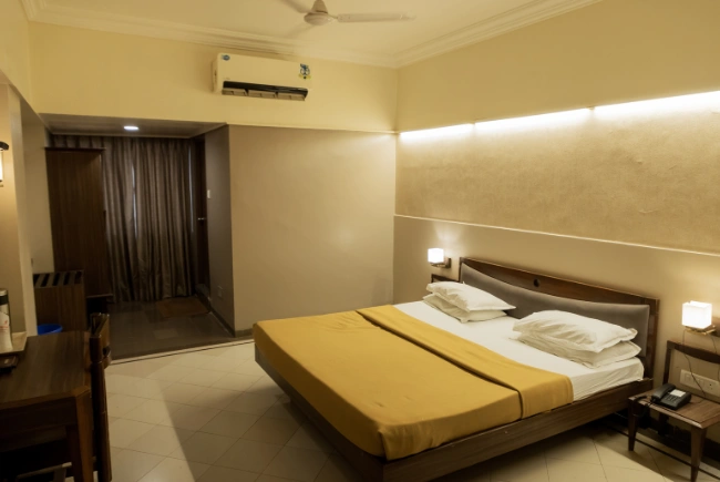 Enjoy our Deluxe AC Room featuring plush bedding, modern décor, high-speed Wi-Fi, flat-screen TV and 24-hour room service. Relax in cool comfort with elegant interiors, perfect for business or leisure stays.